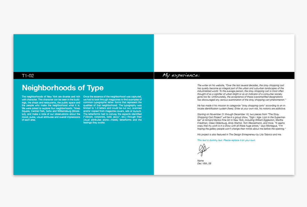 The neighborhoods of New York are diverse and rich with character. This character can be seen in the buildings, the shops and restaurants, the public space and the people who make the neighborhood what it is. We were asked to explore four neighborhoods: Times Square, Central Park, Soho and Williamsburg (Brooklyn), and make a note of our observations about the mood, pulse, visual attributes and overall impressions of each area. Once the essence of the neighborhood was captured, we had to look through magazines to find examples of common typographic letter- forms that represent the qualities of that neighborhood. The typography was limited to 1-3 letters and could be cut out, scanned and/or copied from magazine covers, ads or layouts. The letterforms had to convey the aspects identified (“vibrant, corporate, bold, jazzy”, etc.) through their visual attributes alone—merely letterforms and the feelings they evoke.