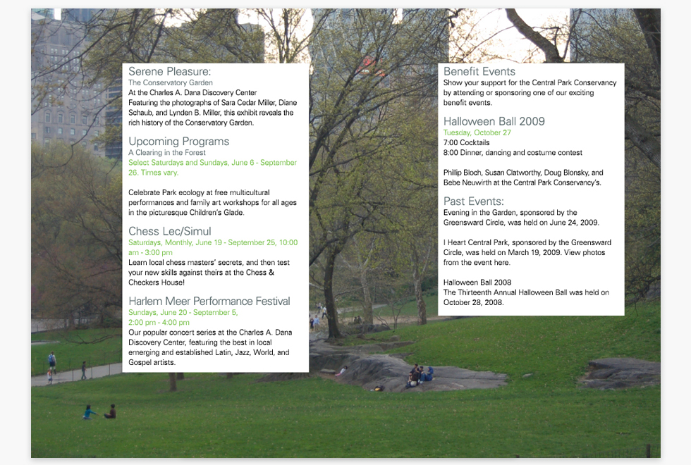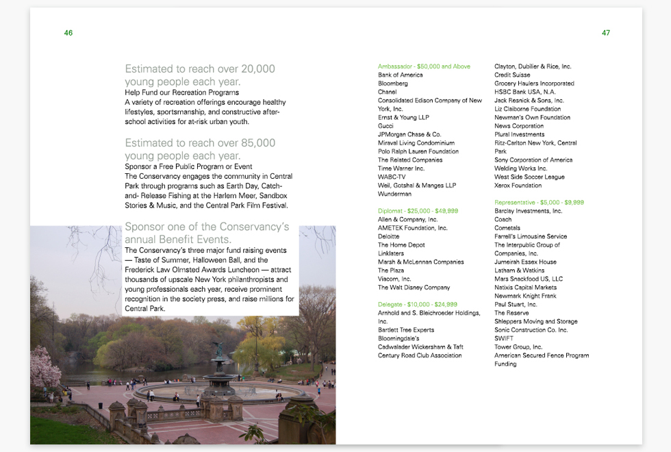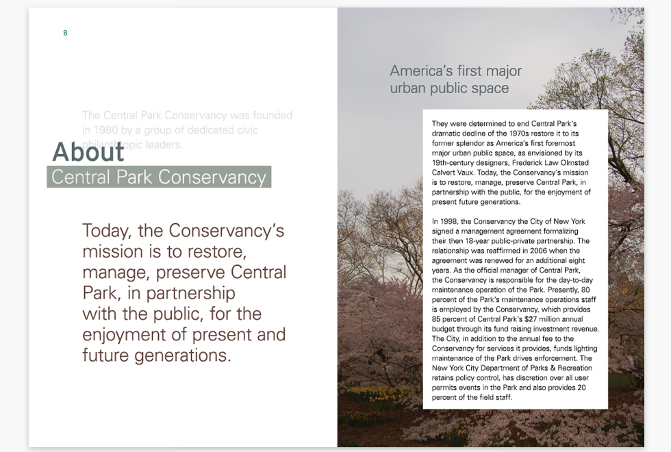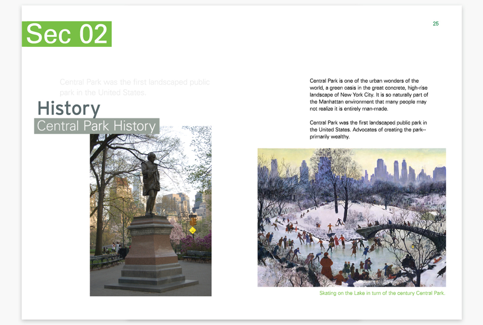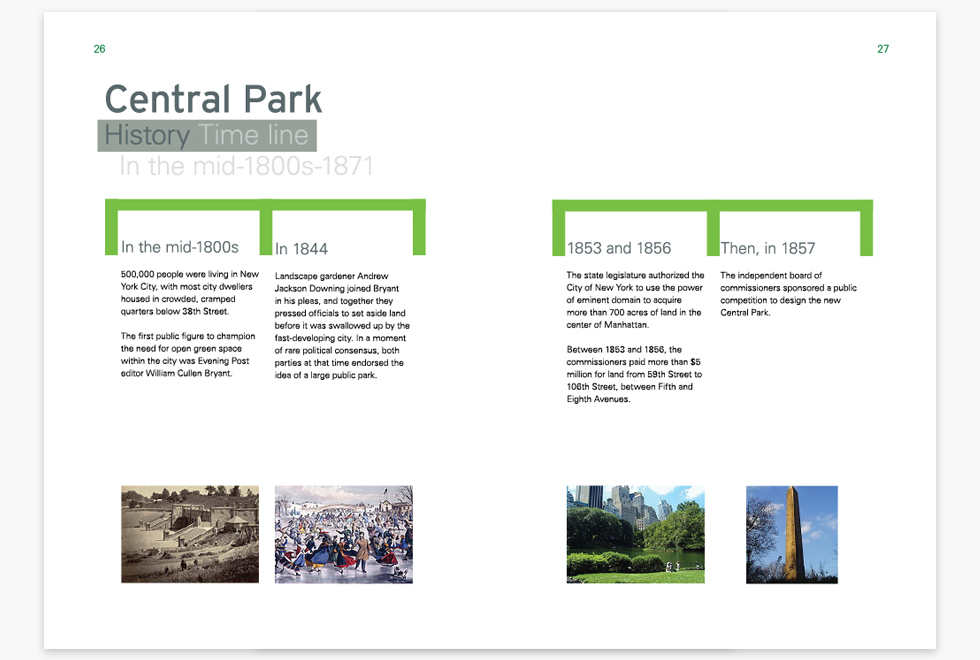 The concepts of Green’s support and protection of the Greensward plan that so much of Central Park is true to its original design. The goal of the Central Park Conservancy is to refurbish, manage, and increase Central Park in partnership with the public.